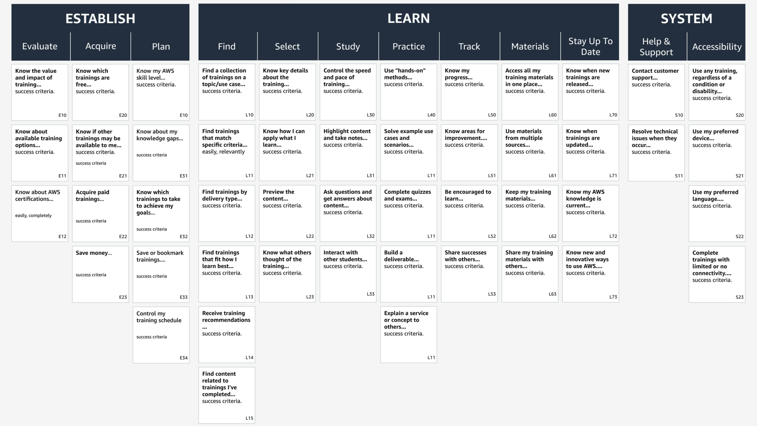 I synthesized 86 existing internal research reports and conducted new interviews across four learner types. This surfaced 63 outcomes representing what customers were actually trying to accomplish. A validation study with 1,200 customers narrowed those to 51 CXOs, organized into four behavior categories. Each CXO included a job statement, success criteria, and behavioral and attitudinal metrics tied to specific product tasks.